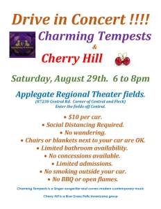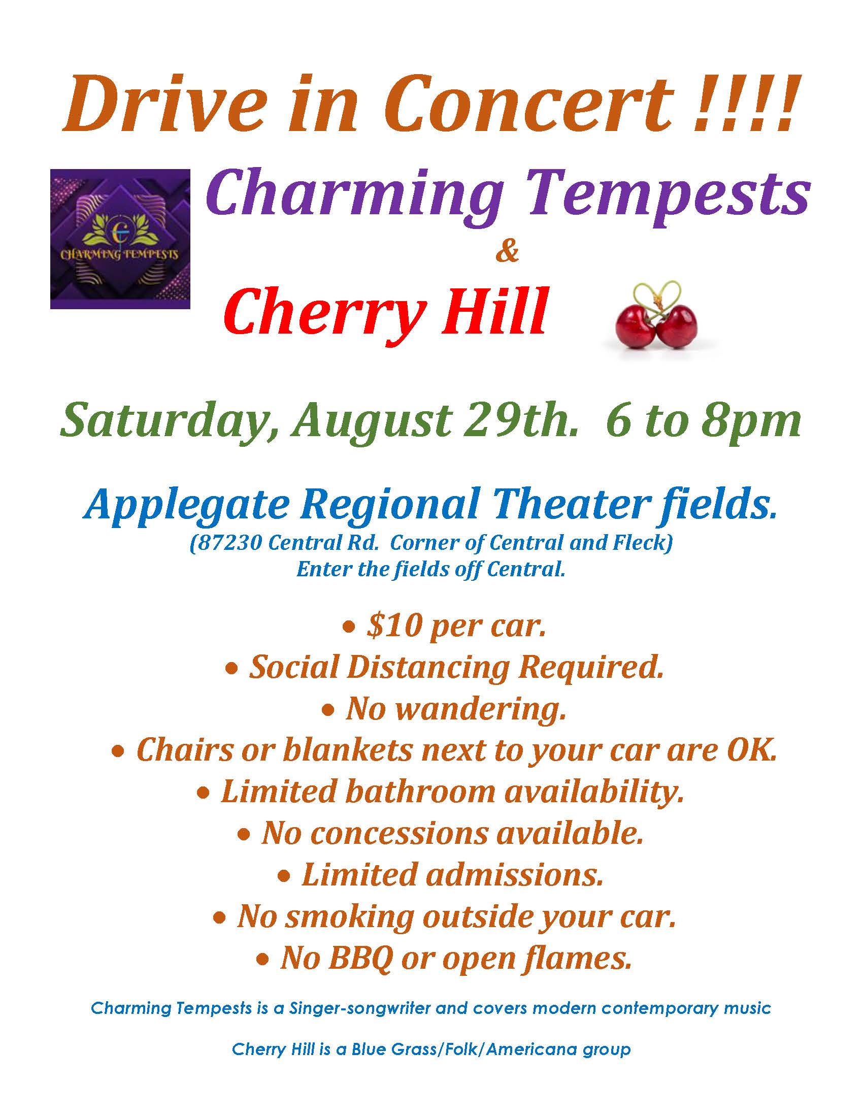 To try and give some of the residents of the area some entertainment while maintaining social distancing, they will be sponsoring a “Drive-In Concert” on Saturday, August 29 at 6:00 to 8:00 p.m. on the grounds behind the theater. Two very talented musical groups will be performing… Charming Tempests will be singing and playing modern contemporary music and Cherry Hill is a Blue Grass/Folk/Americana group. Both have gotten fantastic reviews, according to Vicki Sourdry of ART.