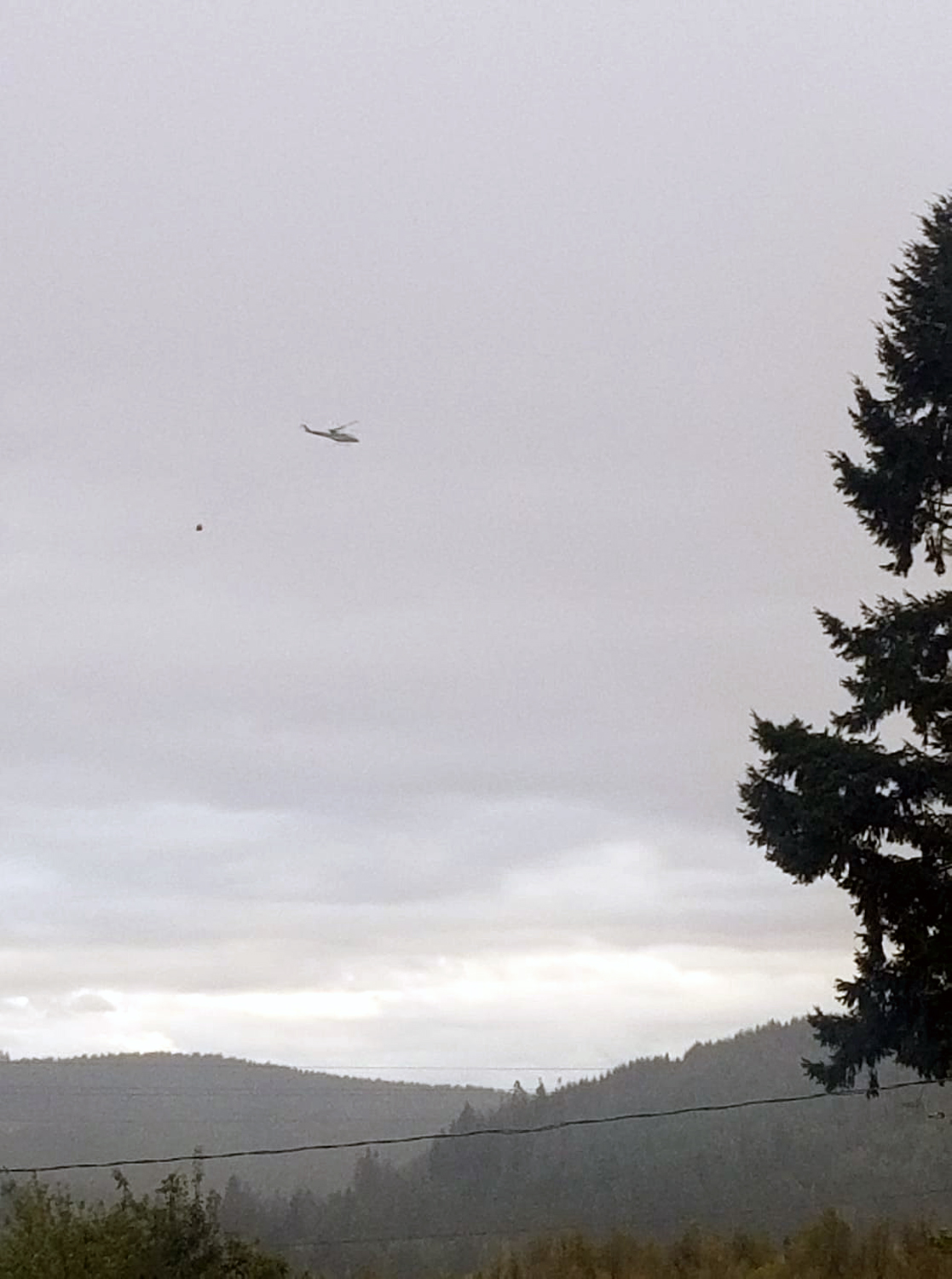 Helicopter with bucket of water heading for the Lorane wildfire on September 23, 2020. Photo by Jessica Betts
