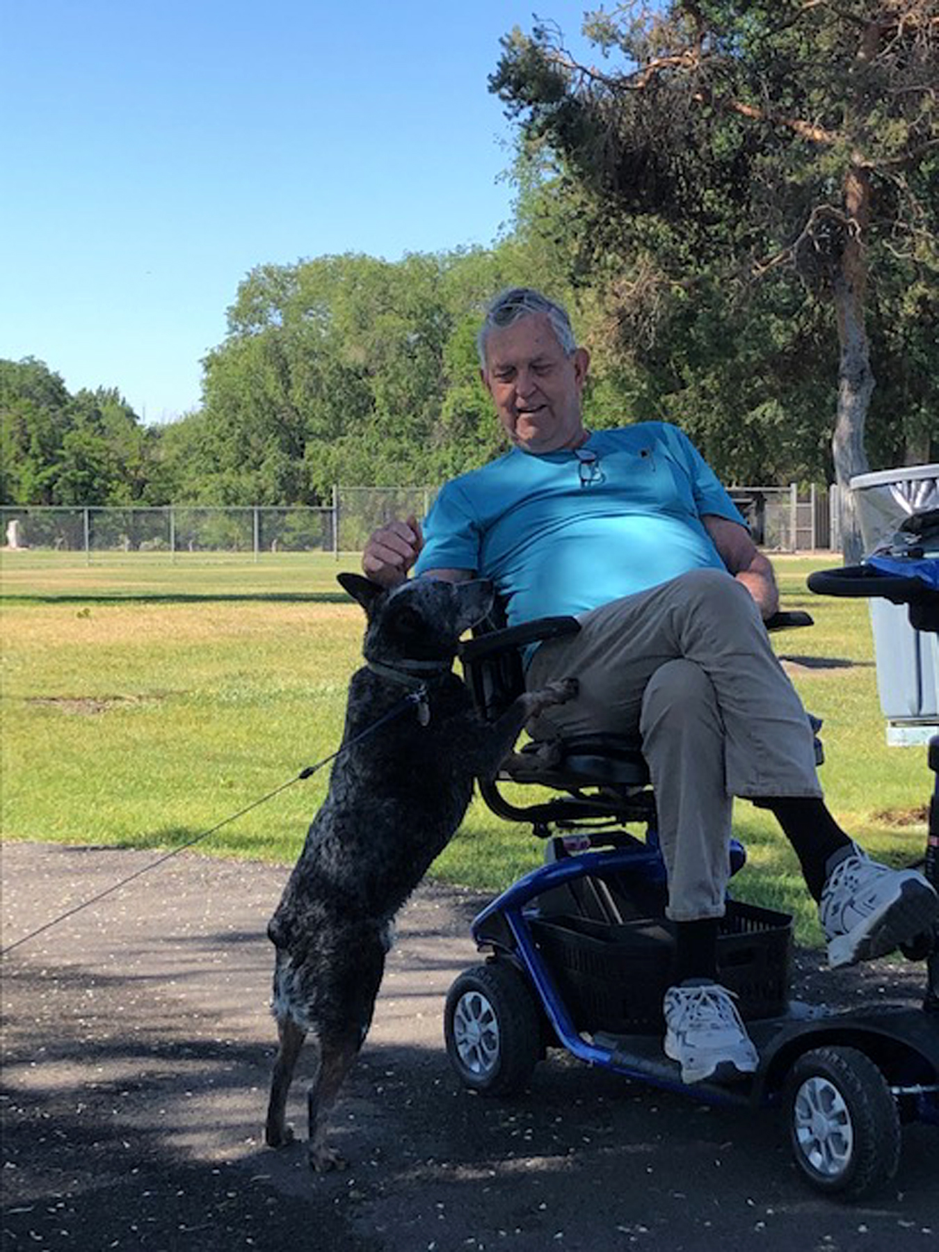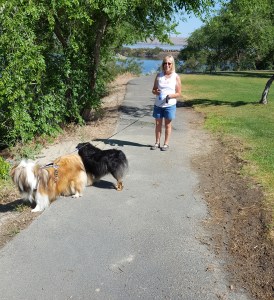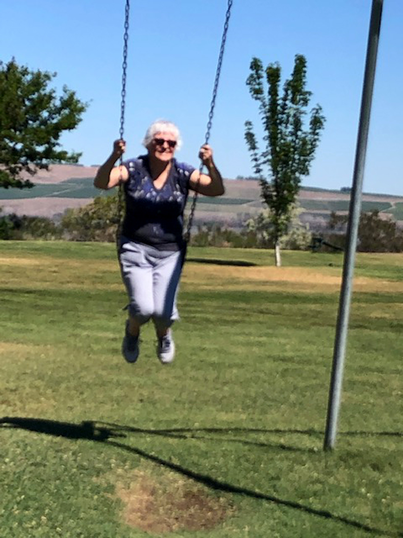 Above the wading pool, my eye kept wandering to the big, sturdy, adult-sized swing set sitting by itself on the green lawn. Memories of my childhood kept pulling at me… Finally, I gave into them, and I made my way there. I handed Toby’s leash to Jim, who came on our “walk” with us on his electric scooter, and picked out one of the swings that I could mount. Once seated, I was pleasantly surprised that the worn trench in the lawn beneath the swing kept my feet from dragging, and I began to pump and soar… just as I remembered doing throughout my childhood.