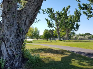 Several years ago, we had our own RV and discovered this beautiful park with B.J. and Dwight when we spent two nights here on the way to a vacation at the Wallowa Lake State Park. Prior to that, Boardman was just an unimpressive town along I-84 that we passed almost every year for 10 years straight on our way to the OSAA 2-A Girls’ Basketball Tournament in Pendleton to watch the Crow Cougars play. Our daughters, Gloria, Michele, and Kelly, were on those teams during that time, and the trek to Pendleton each year was not only a family tradition, but one that was well-attended by many Crow High School fans. (I can’t help but mention here that Gloria still holds the all-time 2-A rebounding record of 26 rebounds in one tournament game against Joseph High School in 1983… that’s another story in itself.)