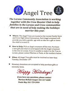 The Lorane Community Association put up their Angel Trees at the Lorane Family Store and Applegate Elementary for area children last week. One of the Holiday Helpers, Rozlyn Fox, shares this information with us about the Angel Trees: