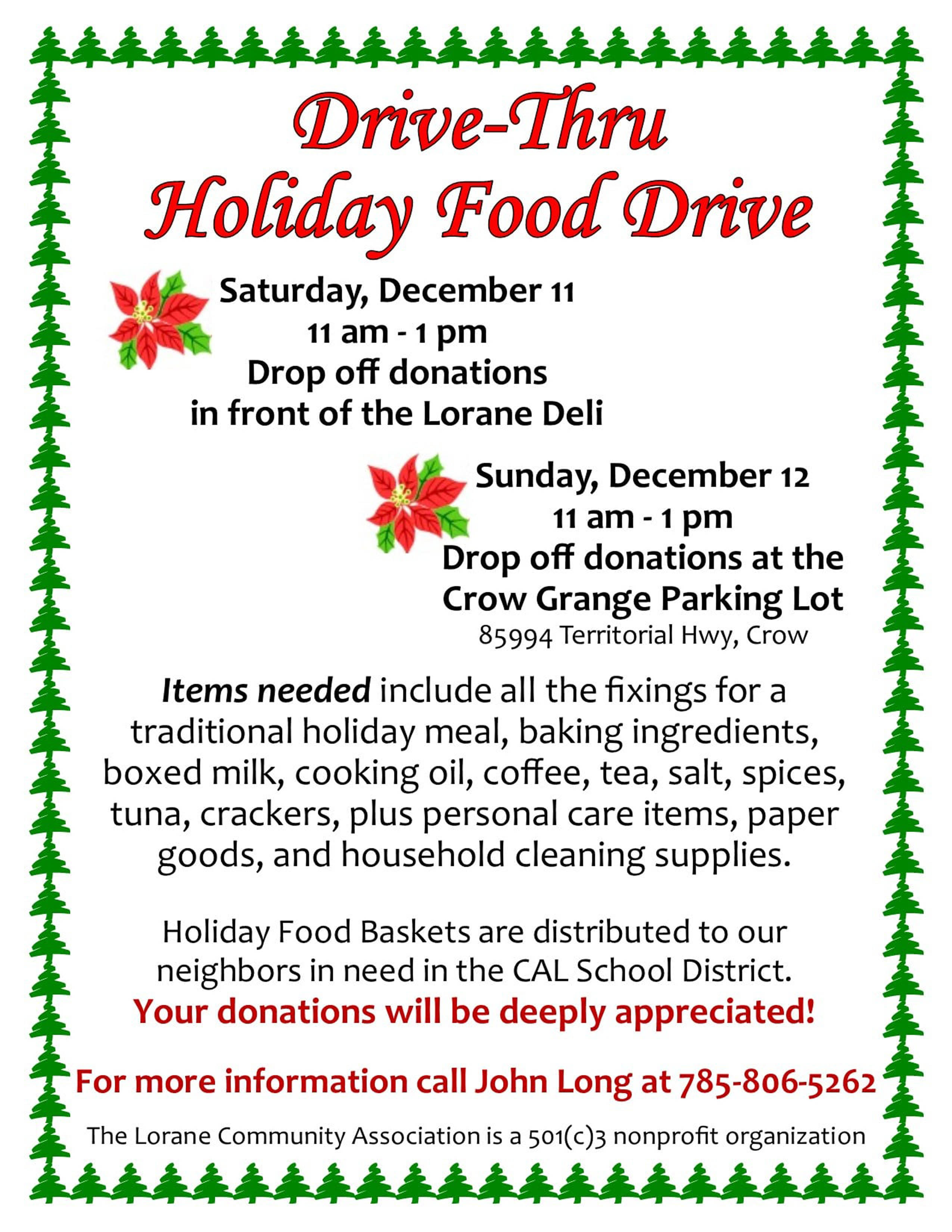 Boxes for the community food drive have been placed at the Lorane Family Store and the post office. Also, a drive-through collection for the annual Lorane Community Food Boxes will take place in front of the Lorane Deli on Saturday, December 11, from 11:00 a.m. to 1:00 p.m. There will be another drive-through collection at the Crow Grange on Sunday, December 12, from 11:00 a.m. to 1:00 p.m., as well. If you or someone you know could use a food box, please let Jennifer and John Long (785-806-5262) or Pam Kersgaard know, or contact one of the Holiday Helpers listed as contacts for the Angel Tree, above. They stress that it’s helpful for them to know if you have any particular requests of items your family prefers or food allergies so they know what foods to include or avoid when packing.