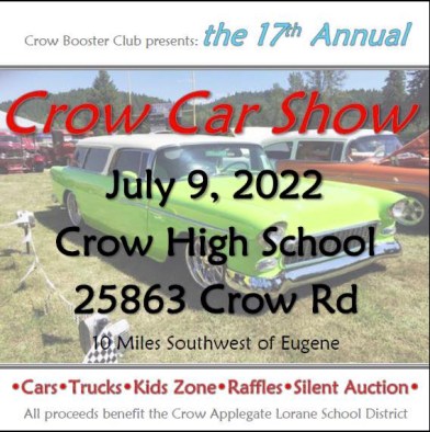 The Crow Car Show is an annual fundraiser that benefits all K-12 age groups affiliated with the Crow-Applegate-Lorane School District. The Crow Booster Club is not just an athletic-based organization. Its projects benefit all student interests and activities.