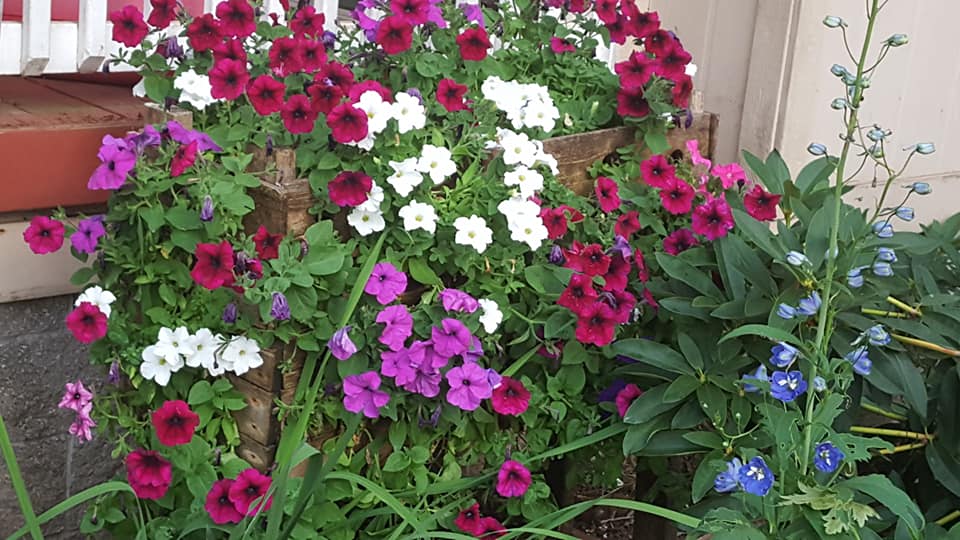 Several years ago, I built petunia boxes for myself and a daughter. I made them out of scrap wood pallets and the construction is nothing I want to brag about… in fact, it’s fortunate that when the petunias are in full bloom, very little of the wood can be seen. Jim helped me drill 1.5″ holes all along the sides and ends of each box and each spring I plant both boxes by shoving the roots through the holes into the planting mix inside the box starting at the bottom and working my way up where I plant the whole top layer.