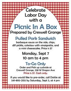 Well, if you have lowered your expectations this year to a one-day picnic along your favorite stream or at the coast, you might make a stop at the Creswell Grange on Monday, September 7, between 10:00 a.m. and 4:00 p.m., to pick up your pre-prepared “Picnic in a Box.” You will need to call ahead and pre-order enough for your needs and pick it up curbside at the grange at 298 W. Oregon Avenue in Creswell. Each picnic box includes a pulled pork sandwich, chips, a dill pickle, coleslaw and a mini cheesecake… all for $7.